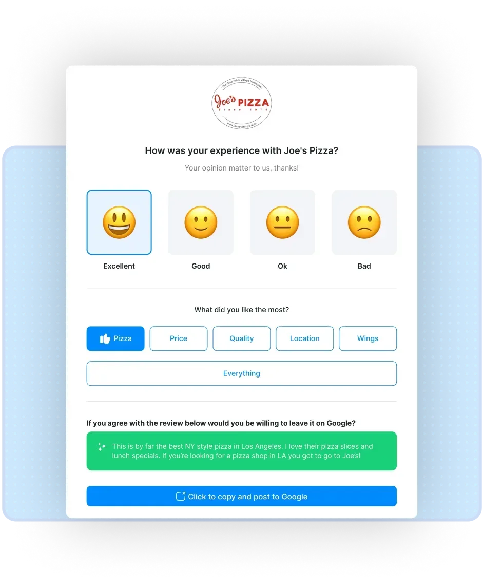 When enabled, our review request tool will ask what they liked the most about your business then instantly write a review for them to paste into Google, giving you more valuable SEO optimized reviews.