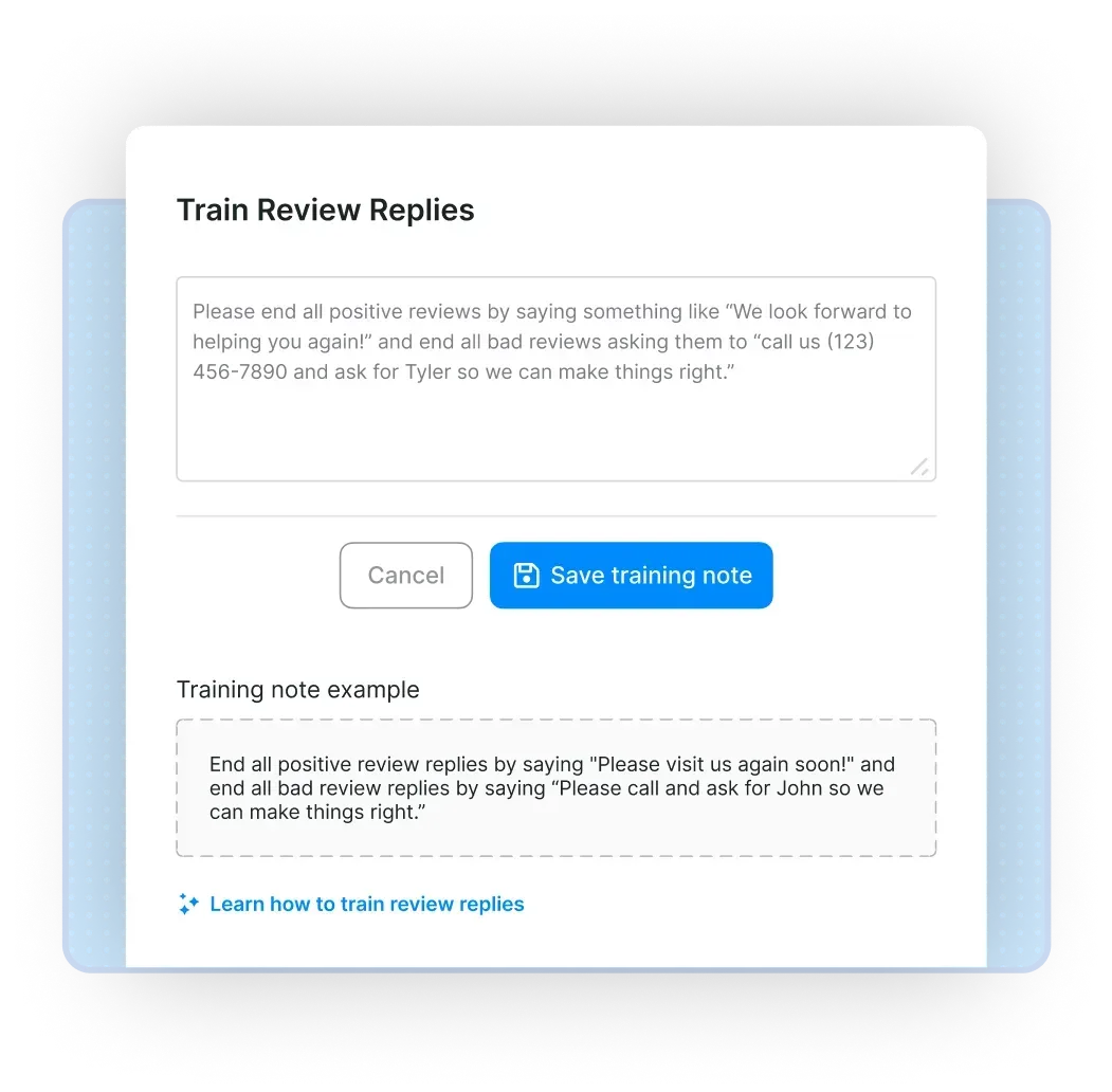You can train our AI to sound exactly how you want, and to handle certain types of reviews exactly how you would. Your customers will have no idea you didn’t write the review response yourself.