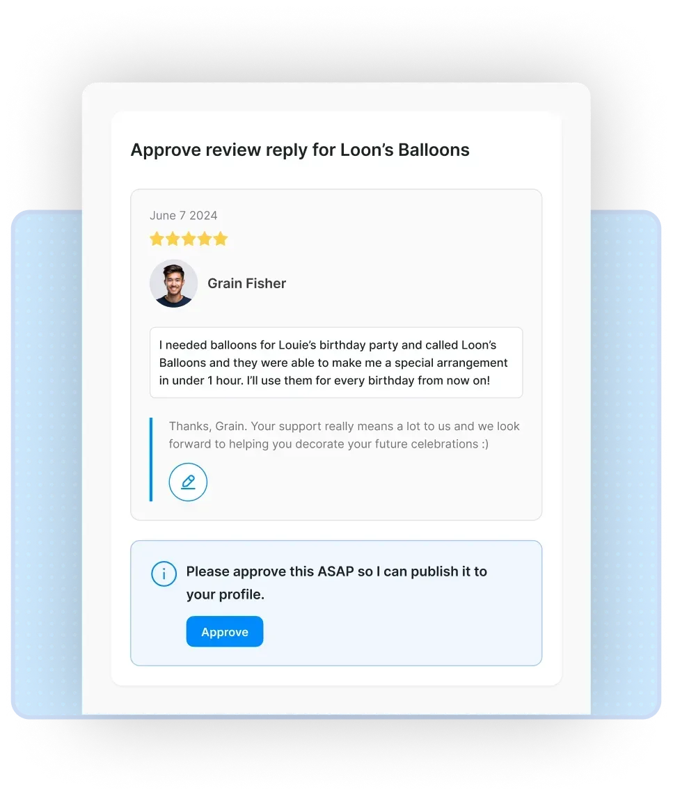 Get emailed suggested review responses so all you have to do is click approve or make small tweaks. Or, turn it on autopilot mode and sit back while it handles all review replies for you.