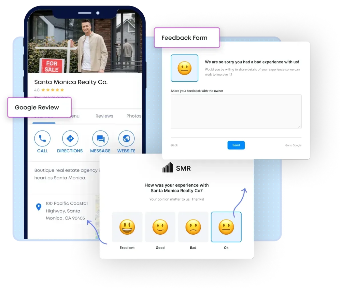 Pick where each type of review goes, GOOD? whether that’s Google, another review platform, a feedback form for those frowns, or even a custom URL.
